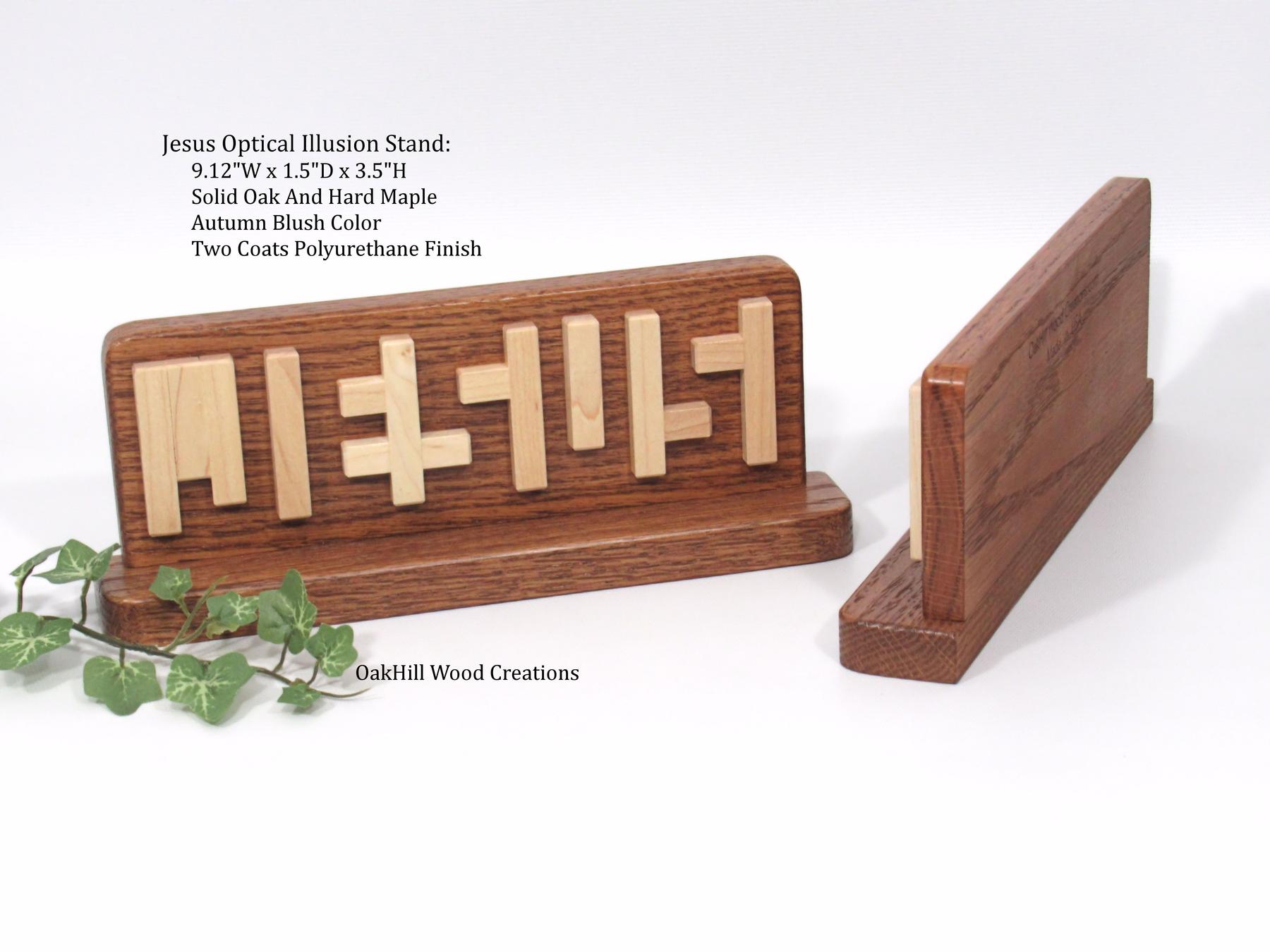 Jesus Illusion, this hidden word Religious sign uses light Maple and darker Red Oak wood to spell out the name Jesus. The Base lets you place this Jesus Sign in any location without additional back support needed.