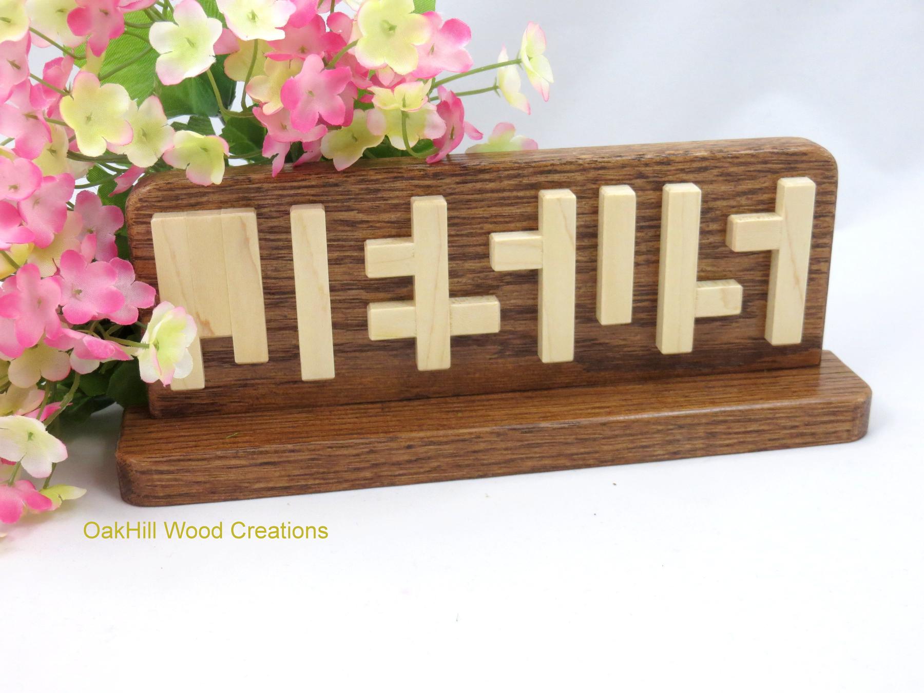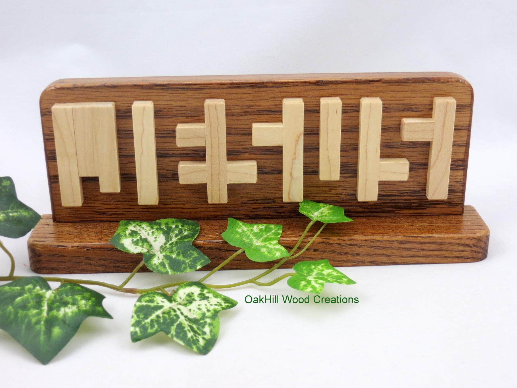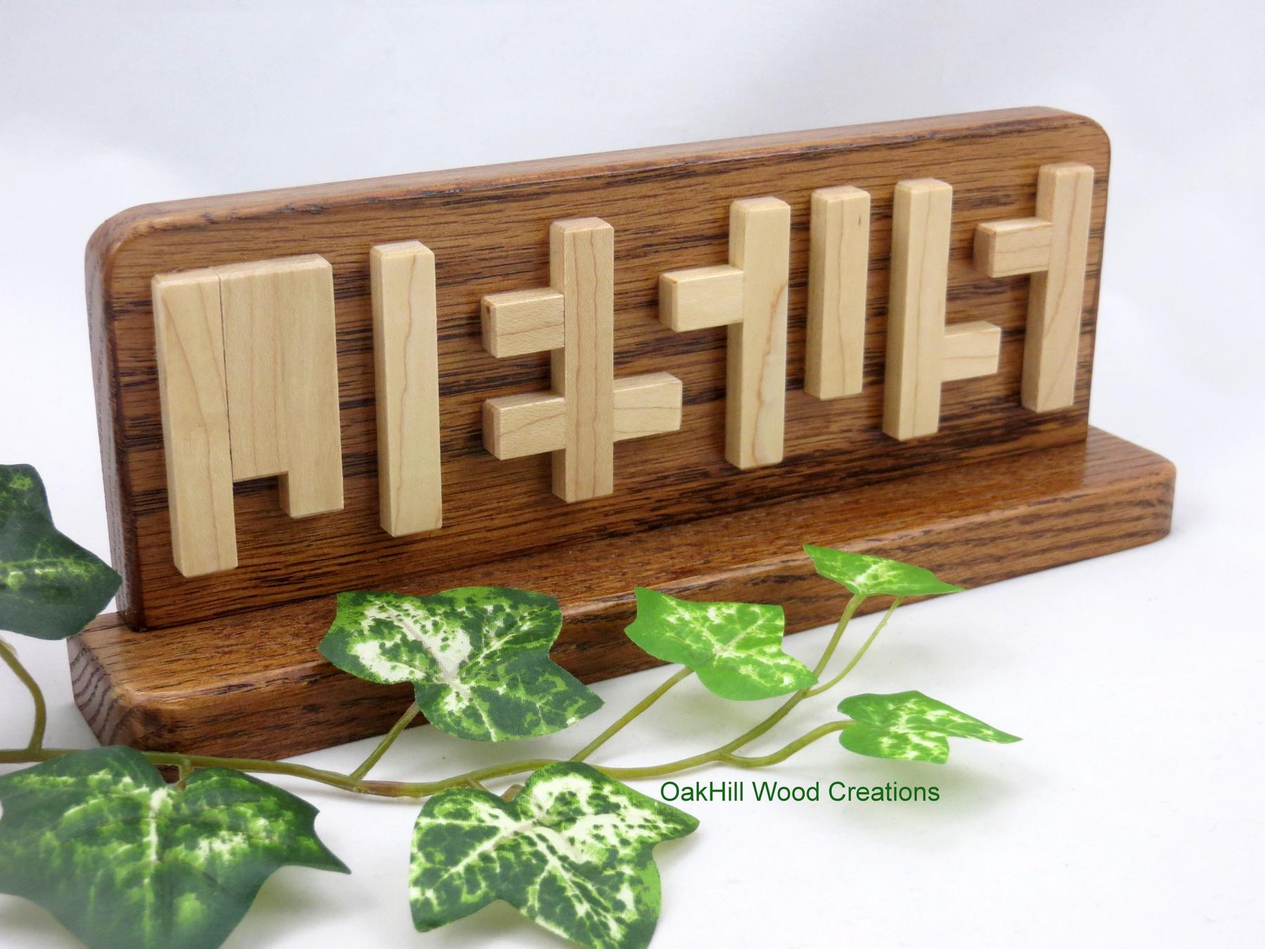 Jesus Illusion, this hidden word Religious sign uses light Maple and darker Red Oak wood to spell out the name Jesus. The Base lets you place this Jesus Sign in any location without additional back support needed.