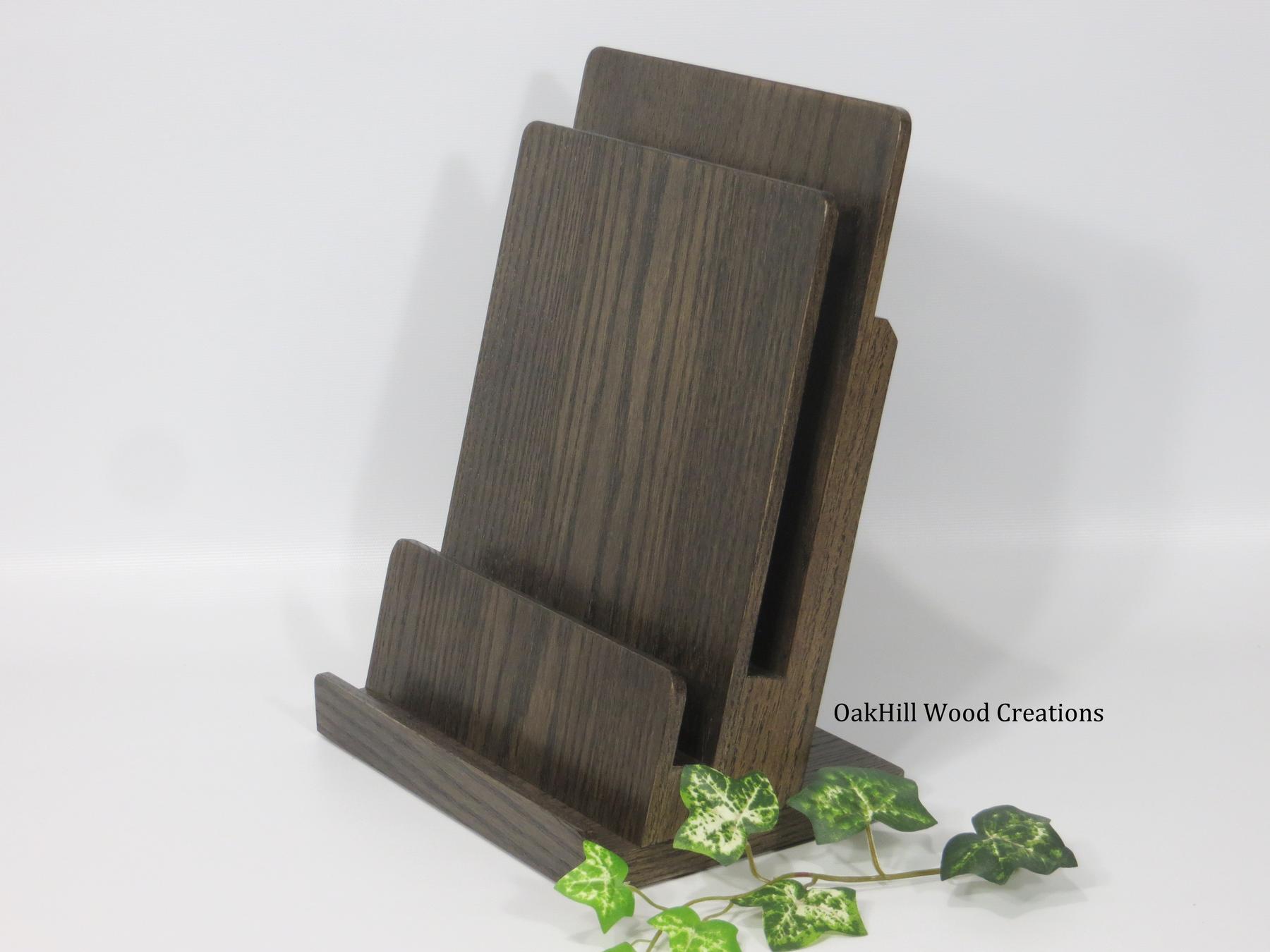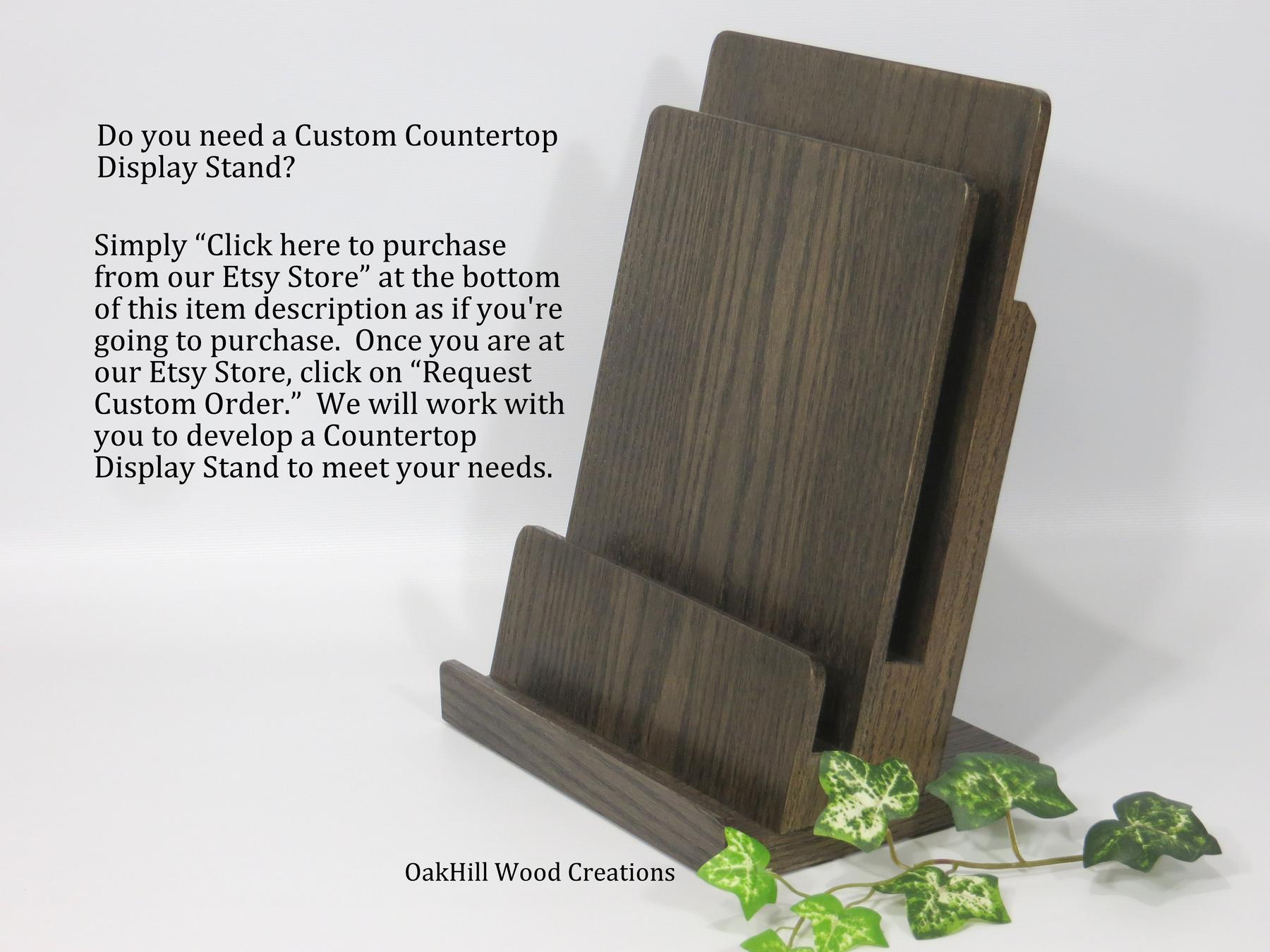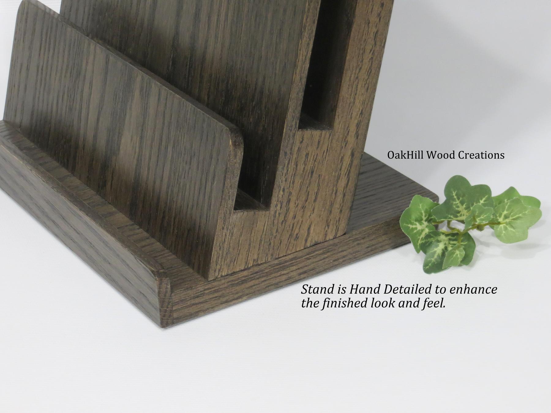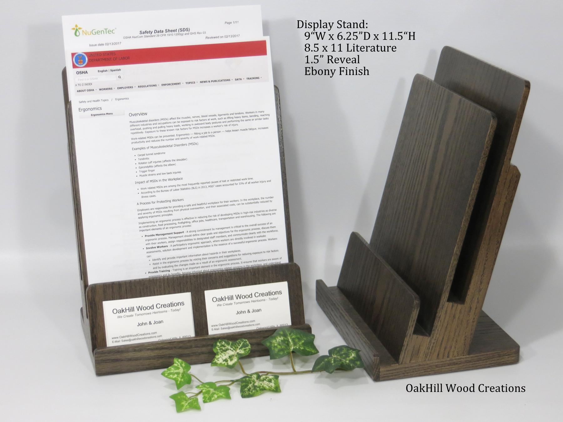 Each stand is handcrafted from Solid Oak and finished in a deep Ebony Stain with two coats of high-quality Polyurethane for lasting protection. The dark finish highlights the natural wood grain, creating a beautiful contrast that enhances your printed materials.