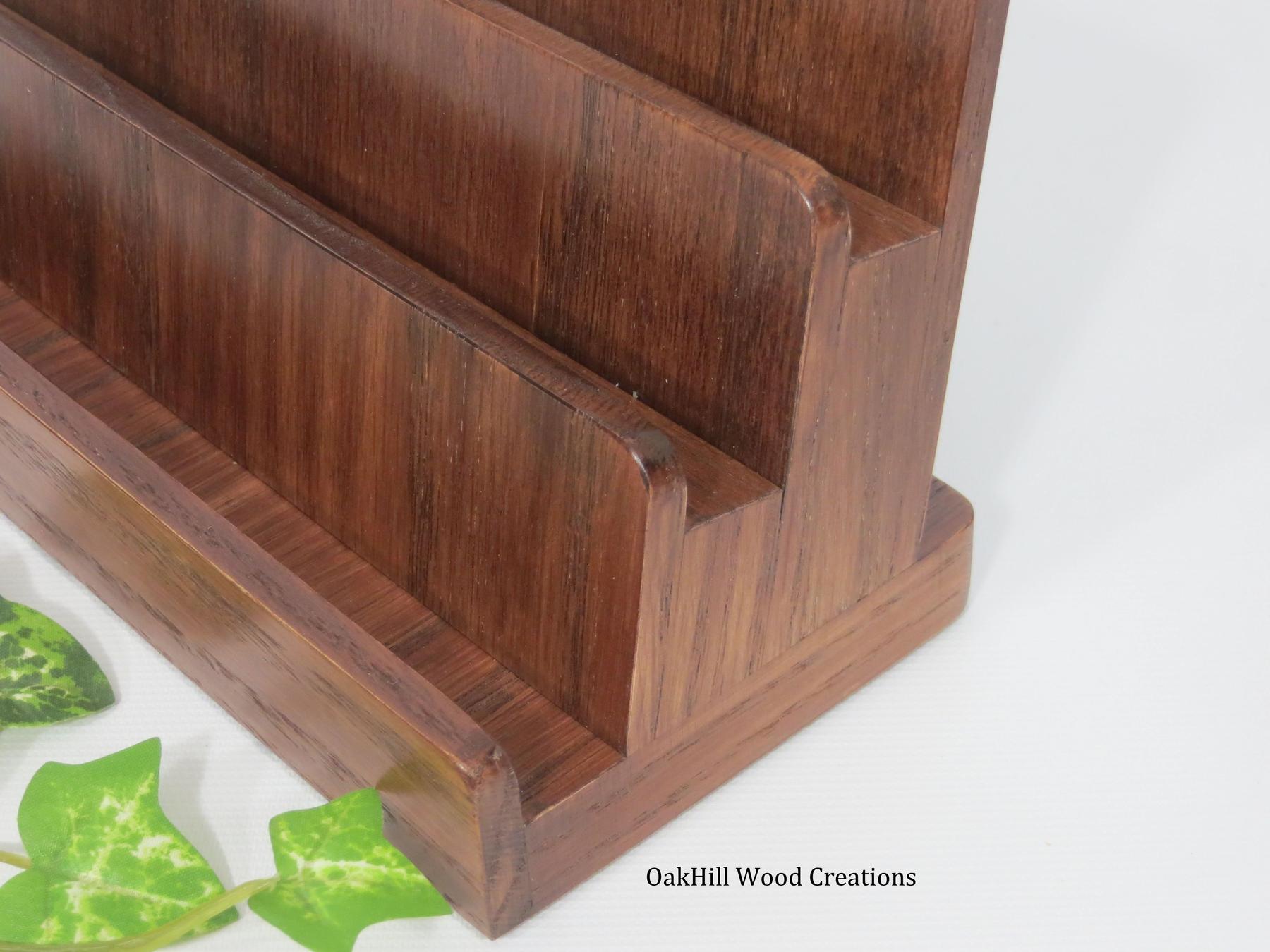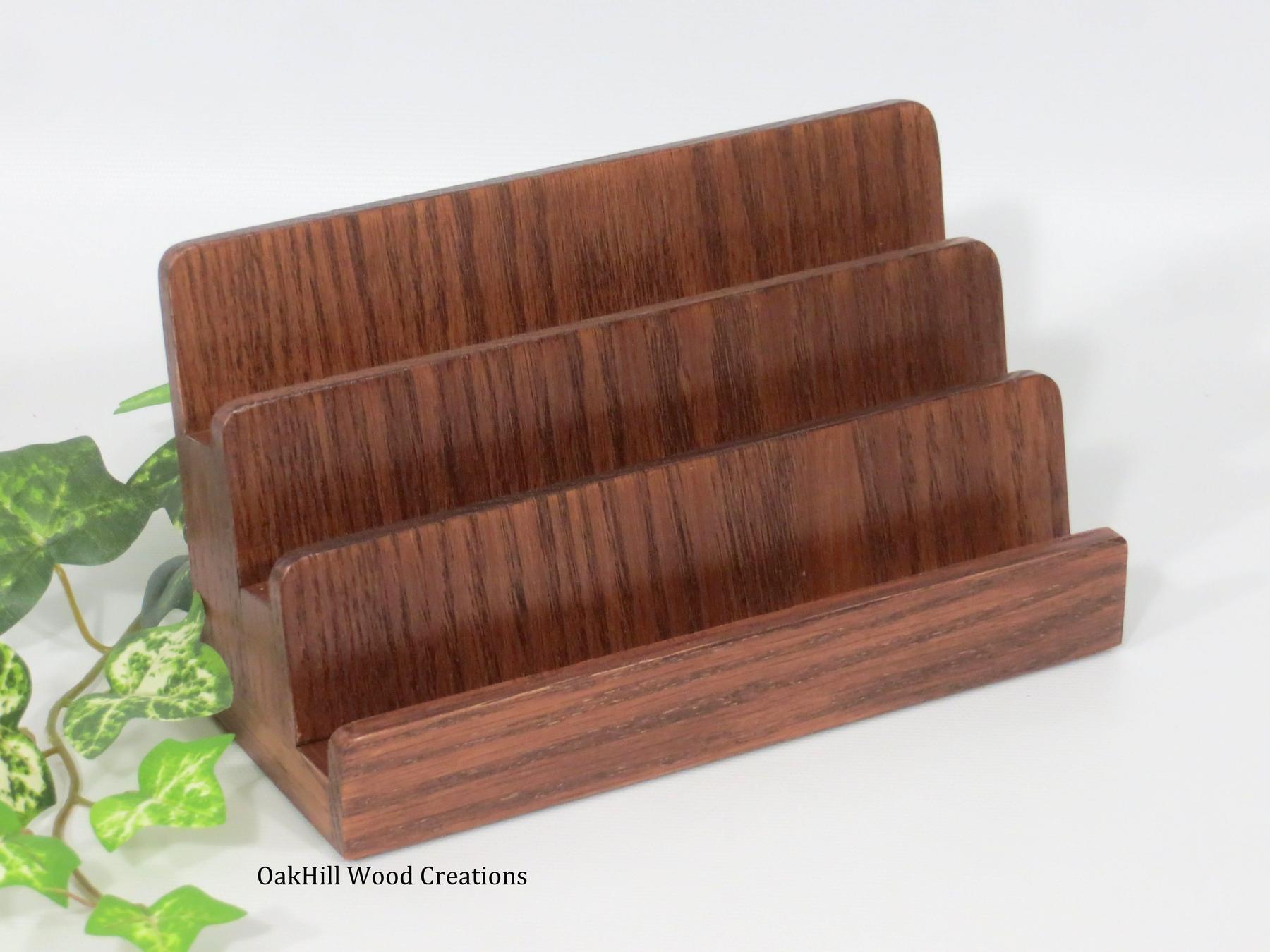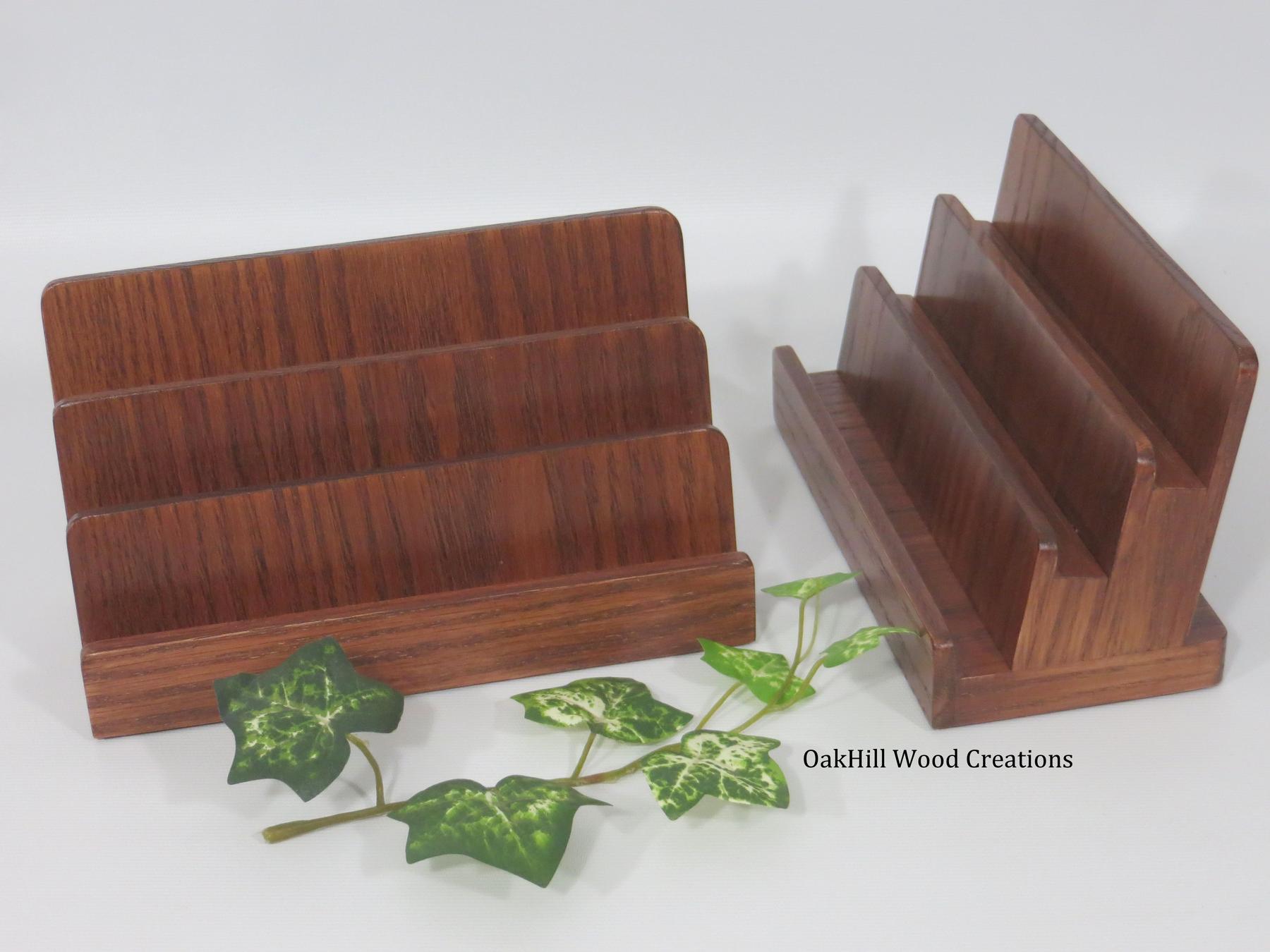 Our Solid Oak Business Card Display Stand is a compact, handcrafted 3-tier organizer designed to neatly showcase up to 6 sets of standard business cards in a professional, space-saving layout.