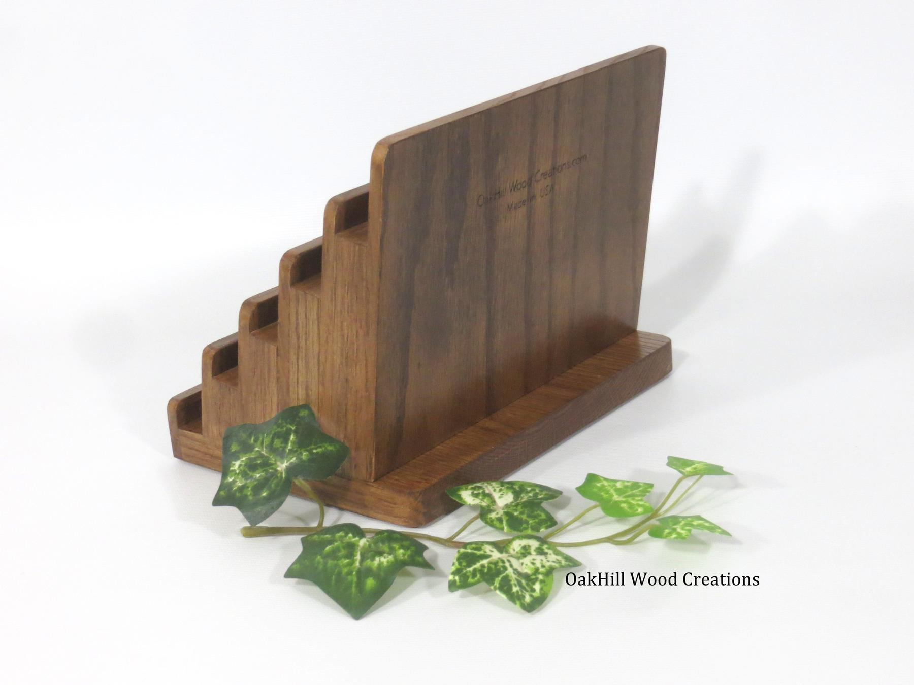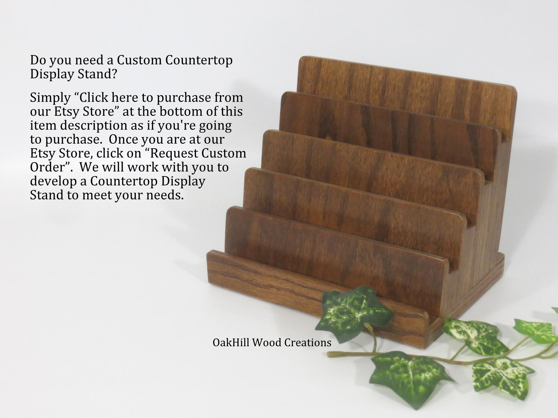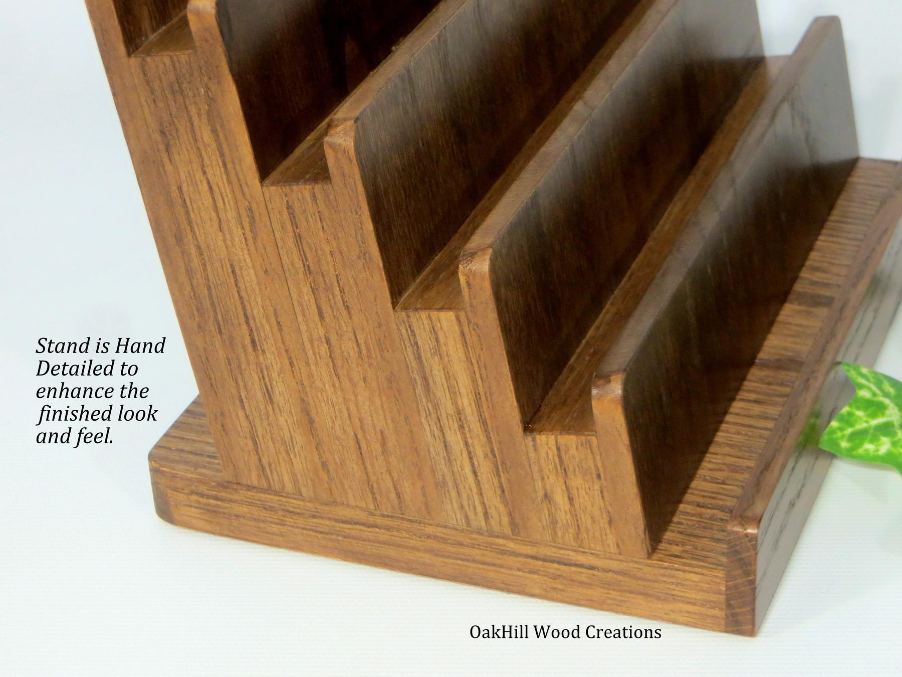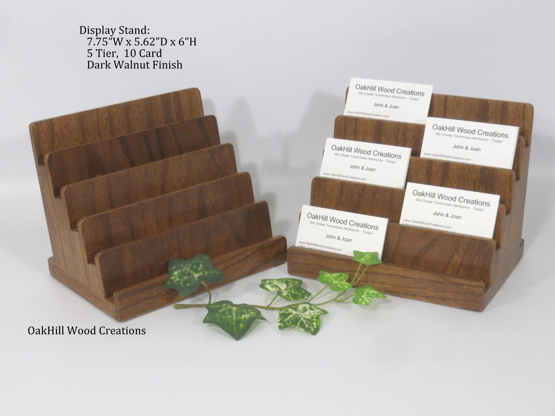 Our Solid Oak Business Card Display Stand is a compact, handcrafted 5-tier organizer that neatly showcases up to 10 sets of standard cards in a professional and space-saving design.Wood Business Card Display Stand, 5 Tier, Solid American Oak Wood. This compact design holds up to 10 different sets of standard (2” x 3.5”) business cards, each set consisting of approximately 30 cards depending on the thickness of your card stock.