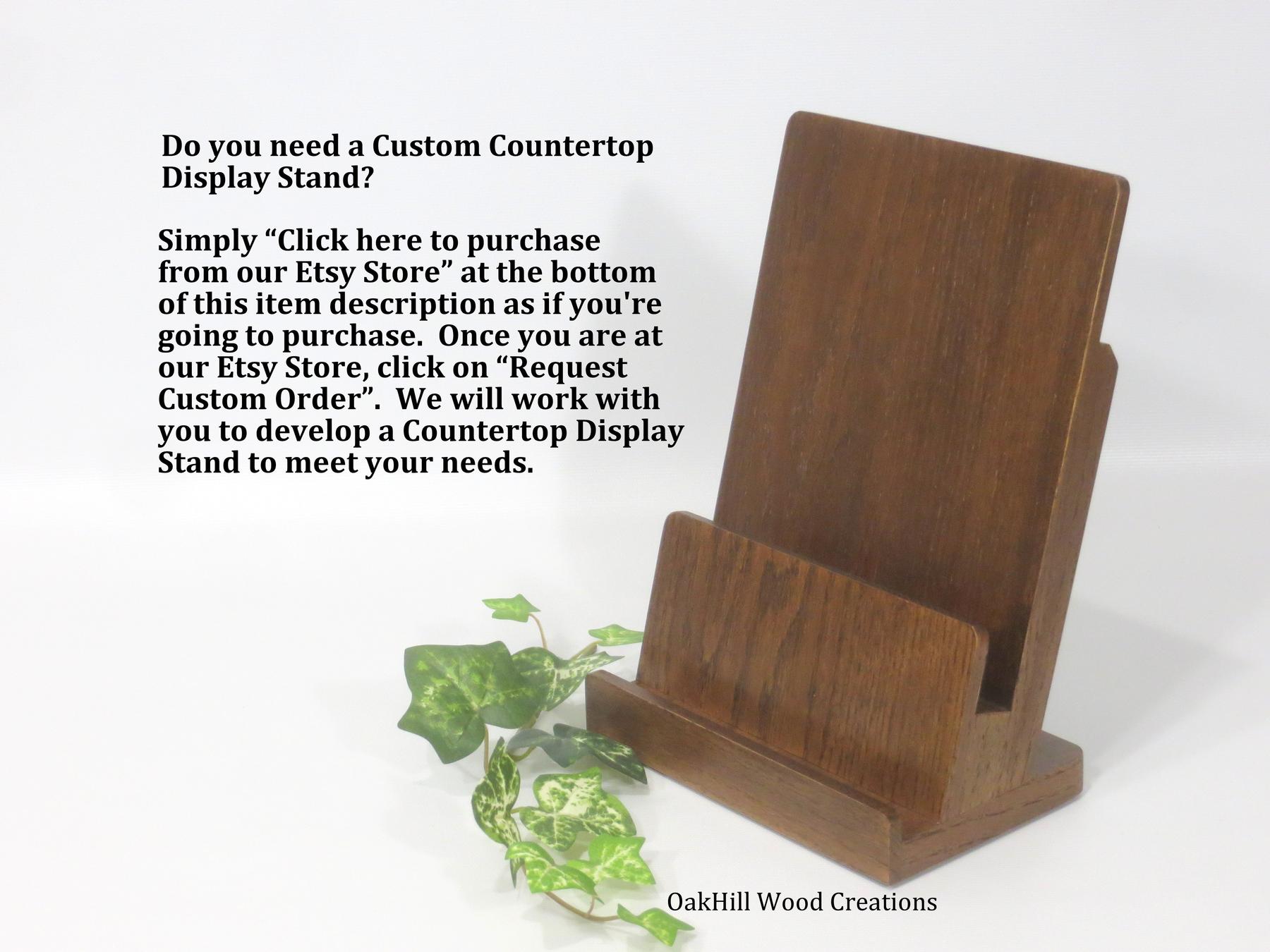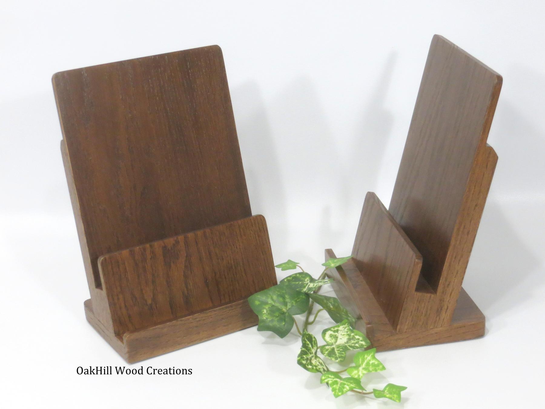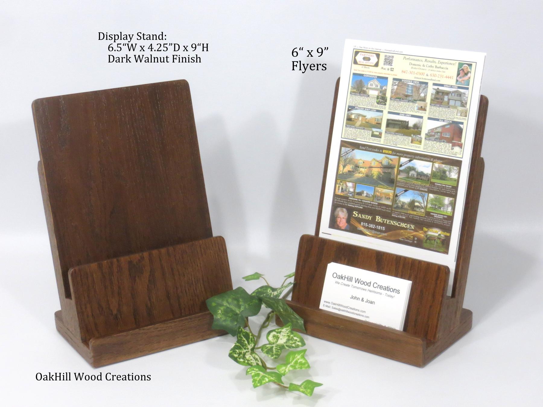 Showcase your brochures and business cards in style with this handcrafted 2-tier display stand, made from solid American oak and finished in a rich dark walnut stain.