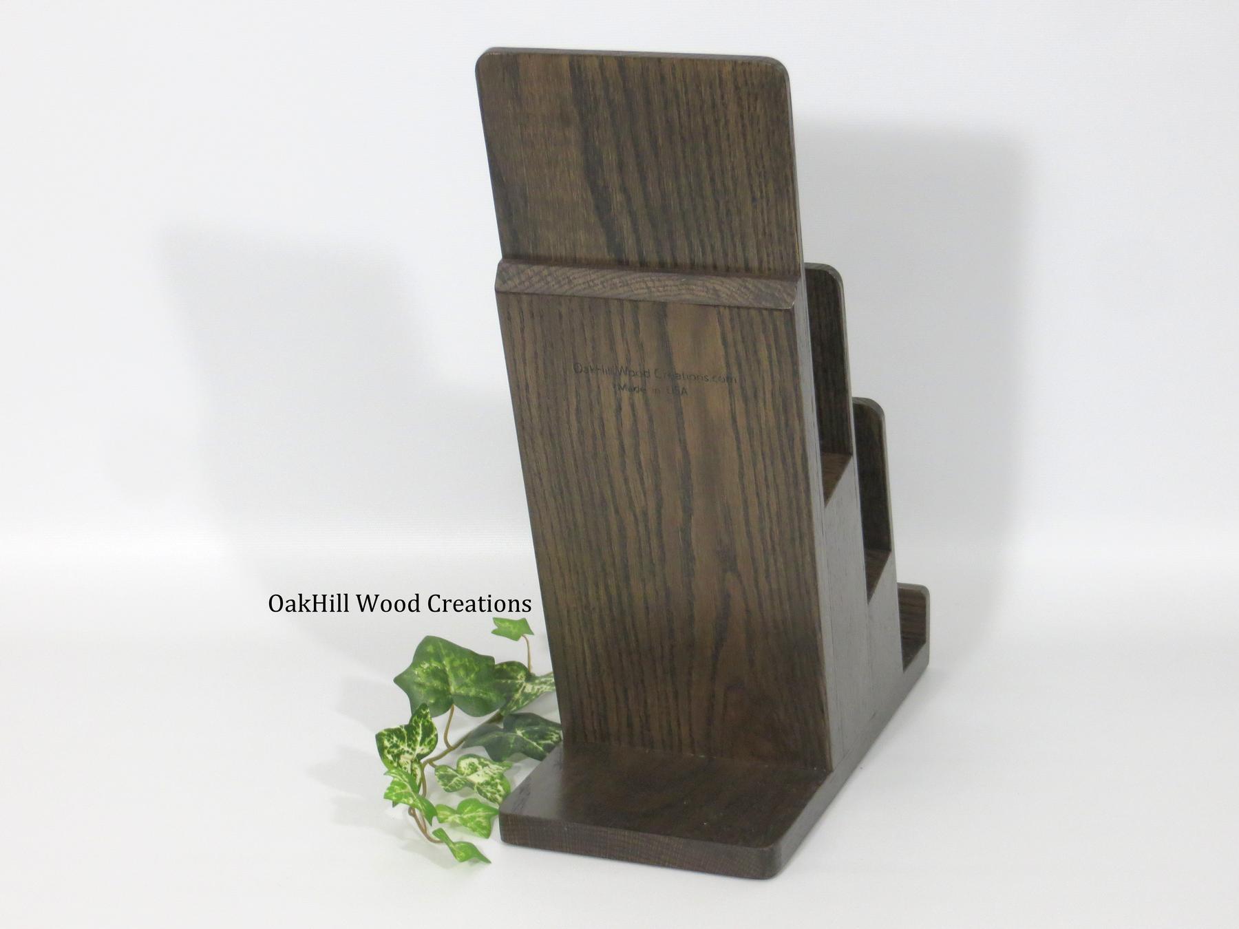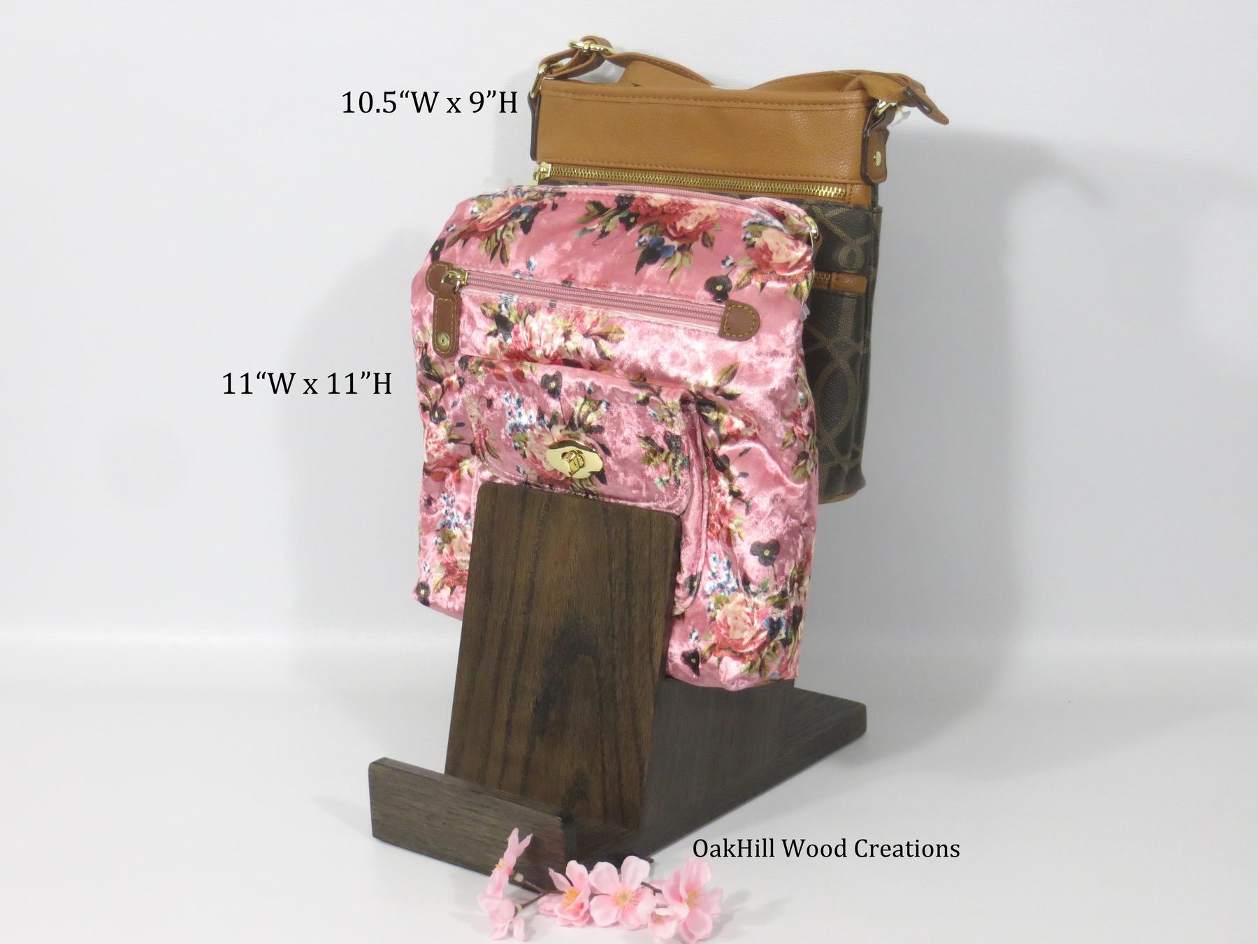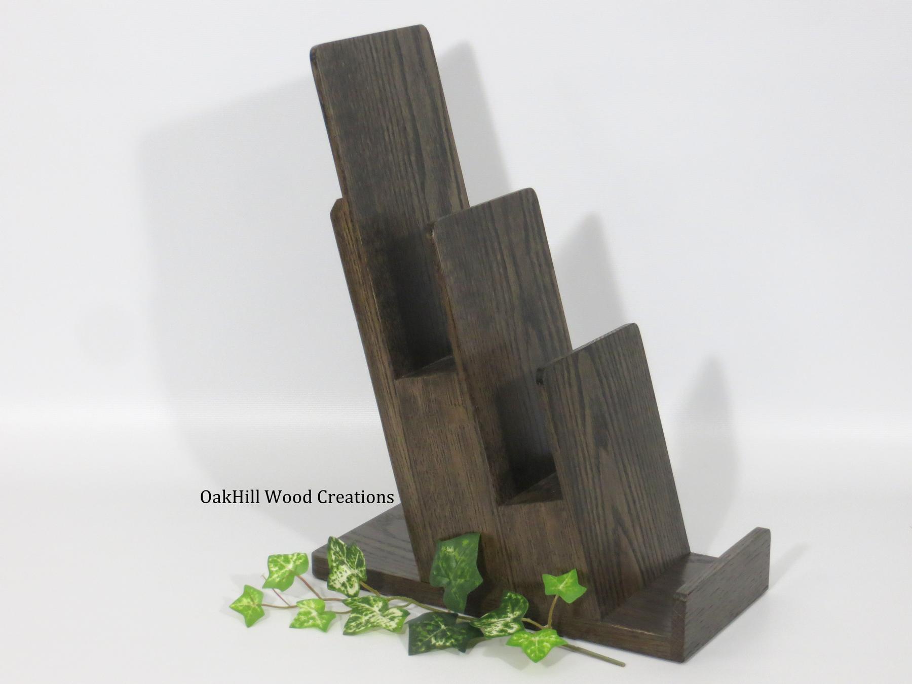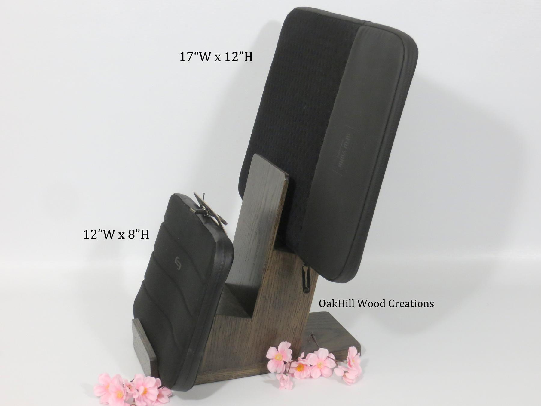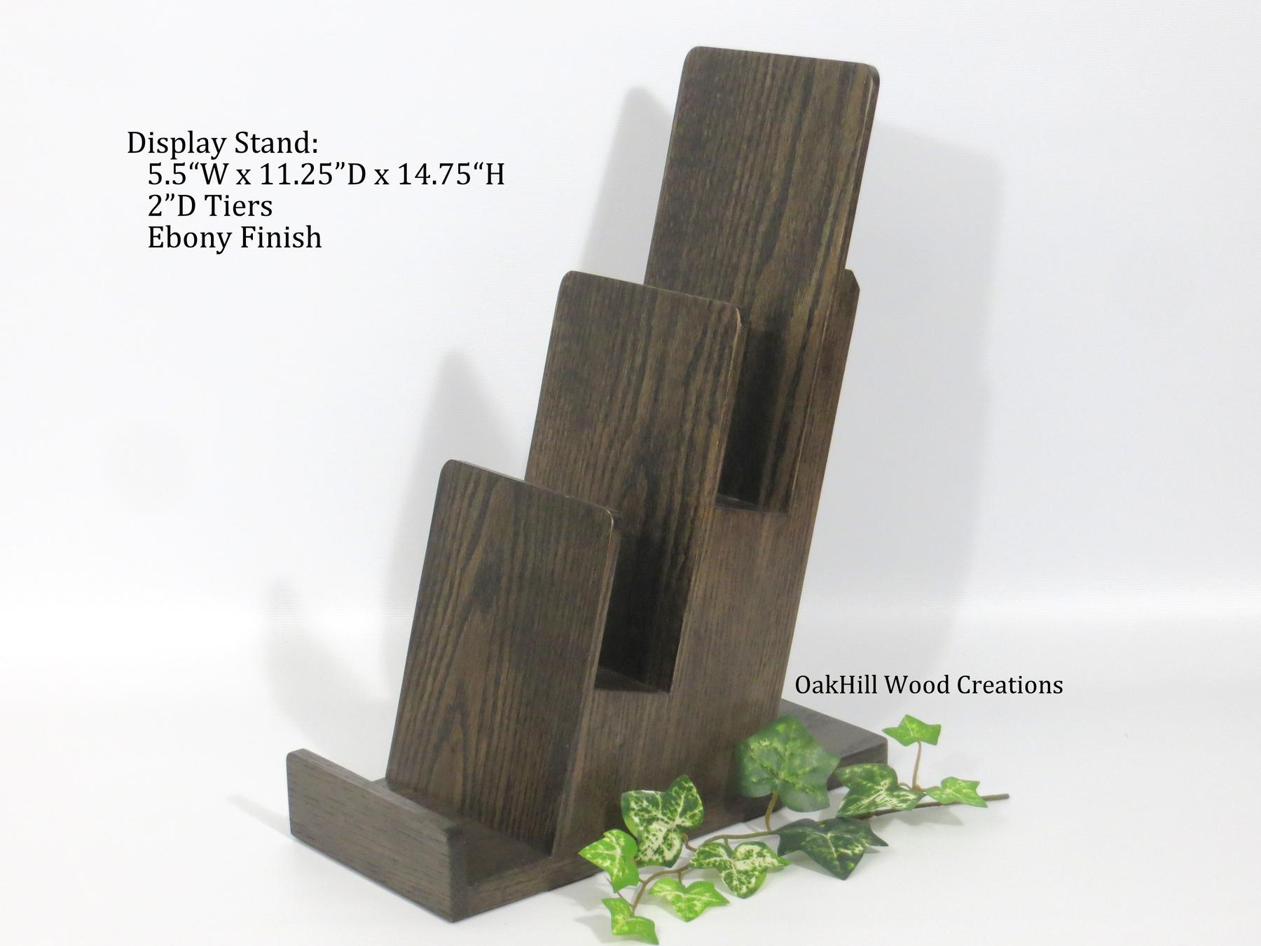 Product Display Stand, 3 Tier with 2” depth each tier, Solid Oak Wood, Ebony Stain. Used at trade shows to display various items such as laptop sleeves, clutch bags, tote bags, tablet cases, designer handbags and leather bags. Items displayed can be seen from a greater distance in an exhibition environment.Adds height and interest in the placement of your products at a Trade Show, Convention, Craft Booth or Expo.