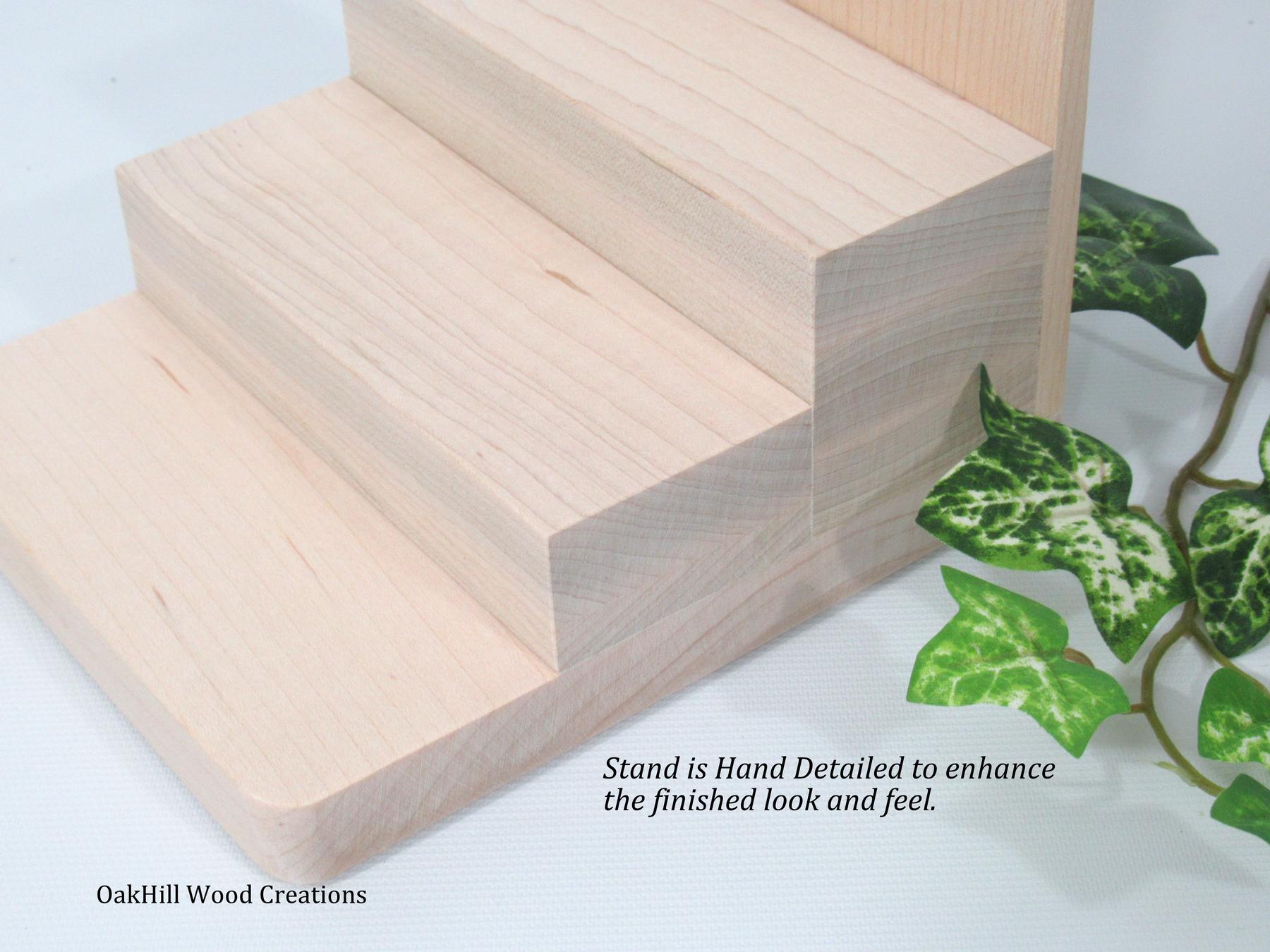 The display Stand is made from Maple Wood and is left unfinished. It is sanded smooth on all surfaces ready for you to stain, varnish, paint or just leave natural.