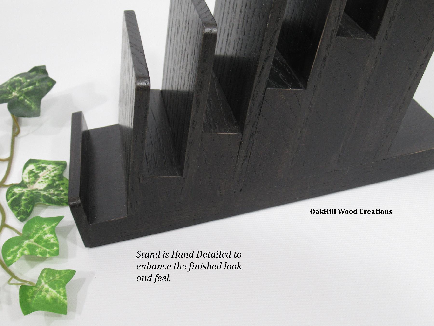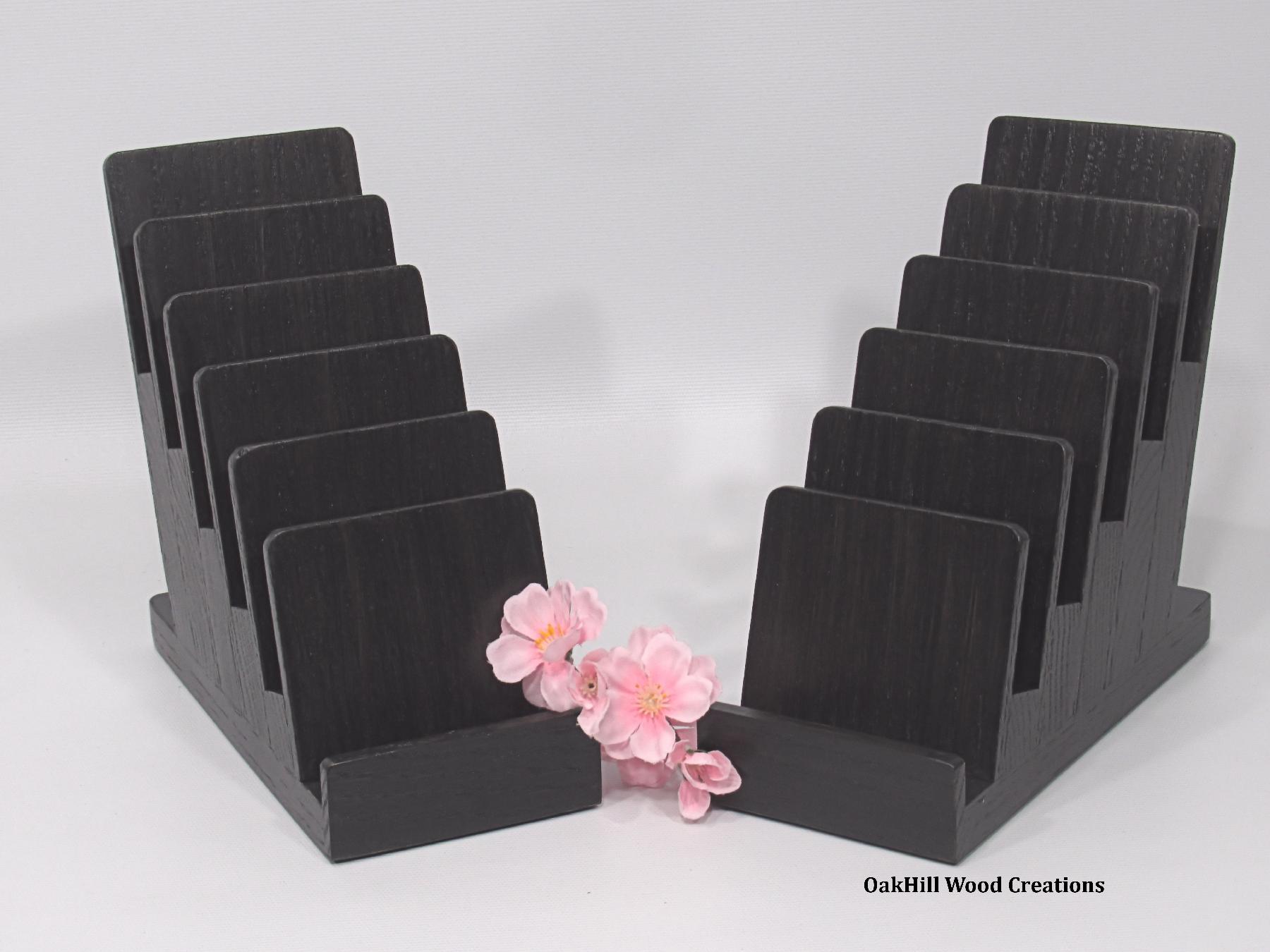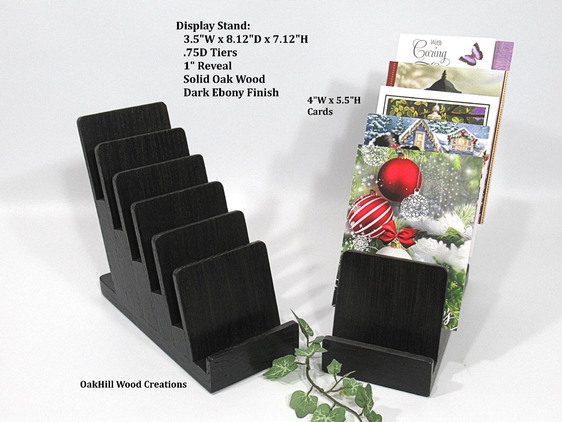 Handcrafted from solid oak and finished in a rich Dark Ebony stain, the natural wood grain shines through, offering a warm, professional look ideal for trade shows, craft fairs, retail counters, or home organization. Two coats of high-quality polyurethane enhance durability and add a subtle sheen. Rubber pads on the base protect surfaces and keep the stand stable.