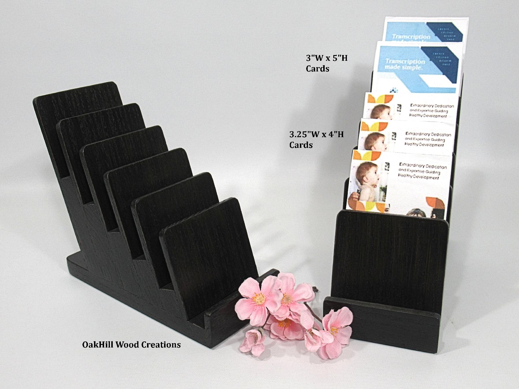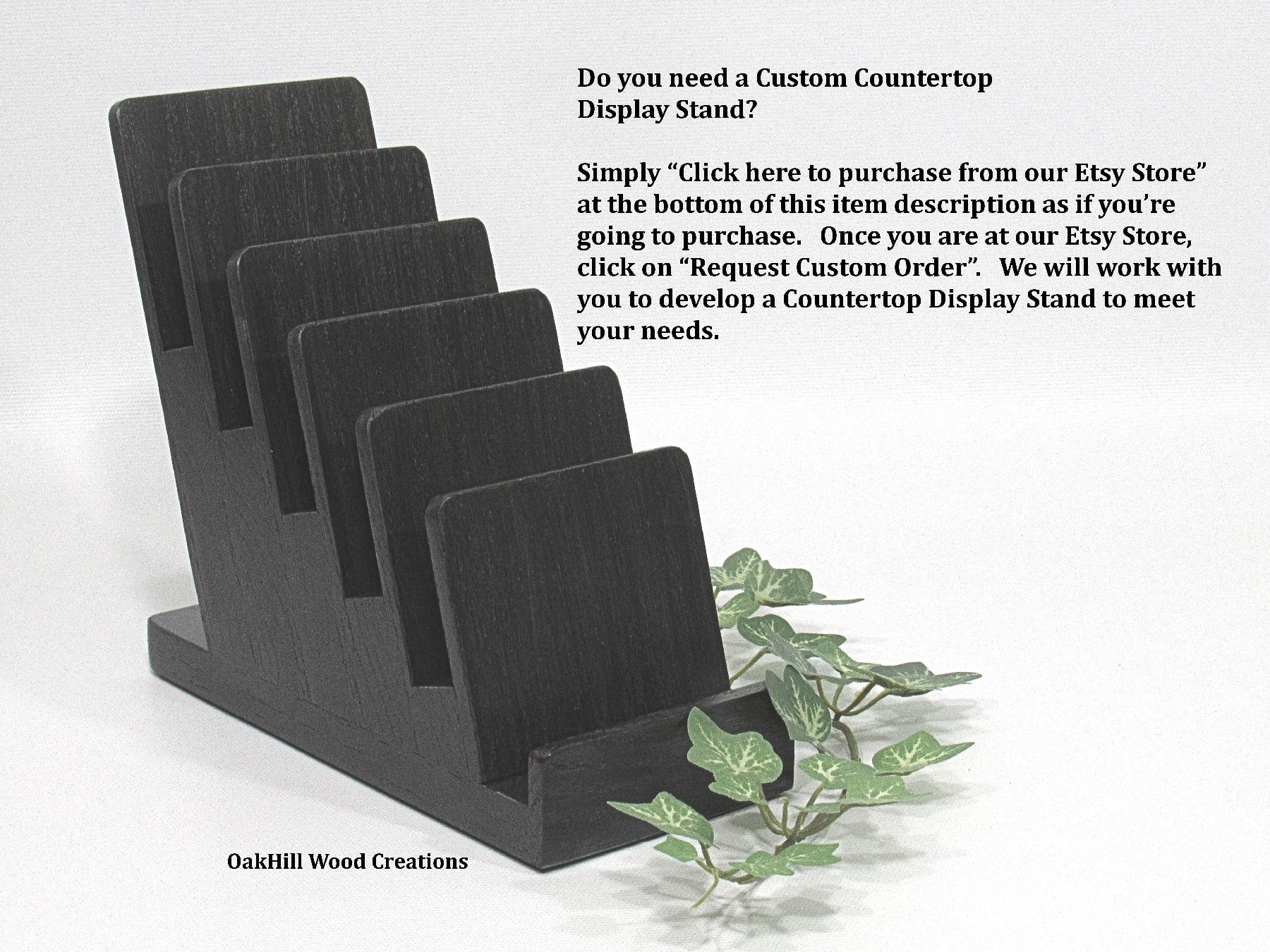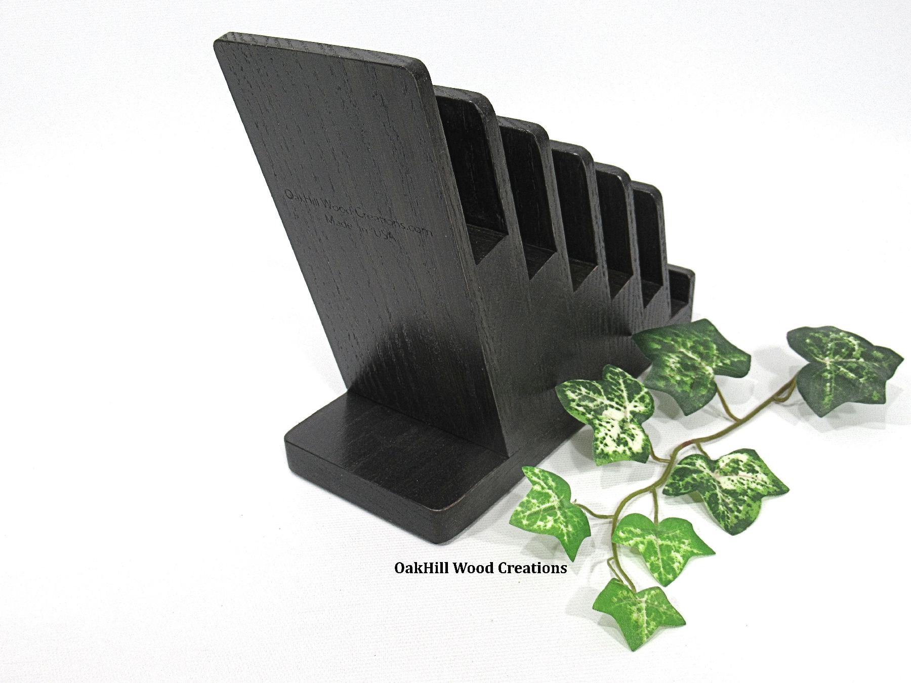 Handcrafted from solid oak and finished in a rich Dark Ebony stain, the natural wood grain shines through, offering a warm, professional look ideal for trade shows, craft fairs, retail counters, or home organization. Two coats of high-quality polyurethane enhance durability and add a subtle sheen. Rubber pads on the base protect surfaces and keep the stand stable.