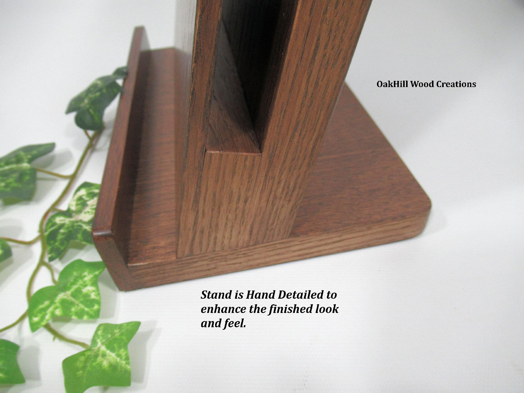 Crafted from Solid Oak, stained in a rich Dark Walnut finish, and protected with two coats of high-quality polyurethane, this display stand provides long-lasting durability and a warm, polished look. The wood grain comes through beautifully, making it an ideal presentation piece for any professional setting. Rubber pads on the bottom protect surfaces and keep the stand securely in place.