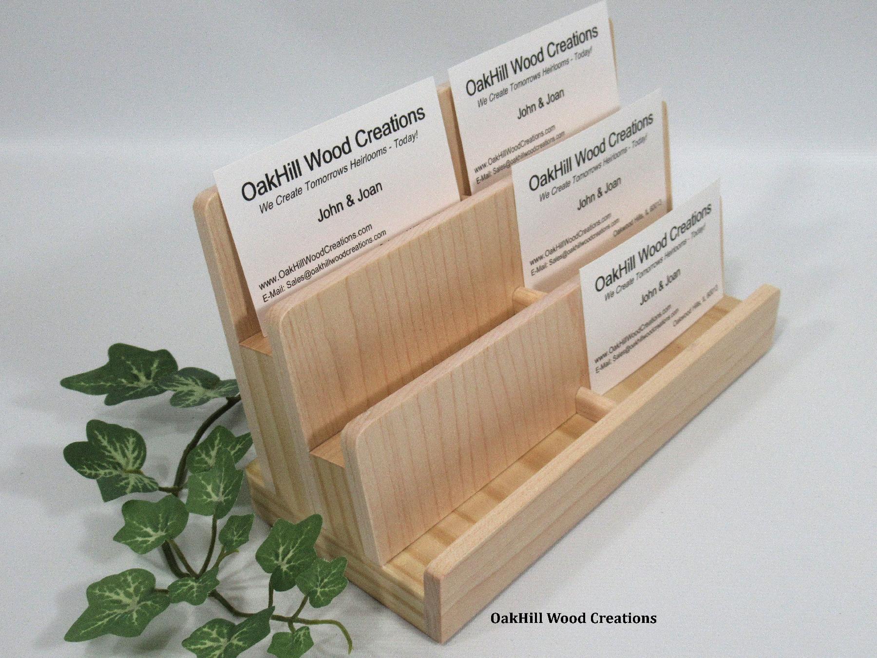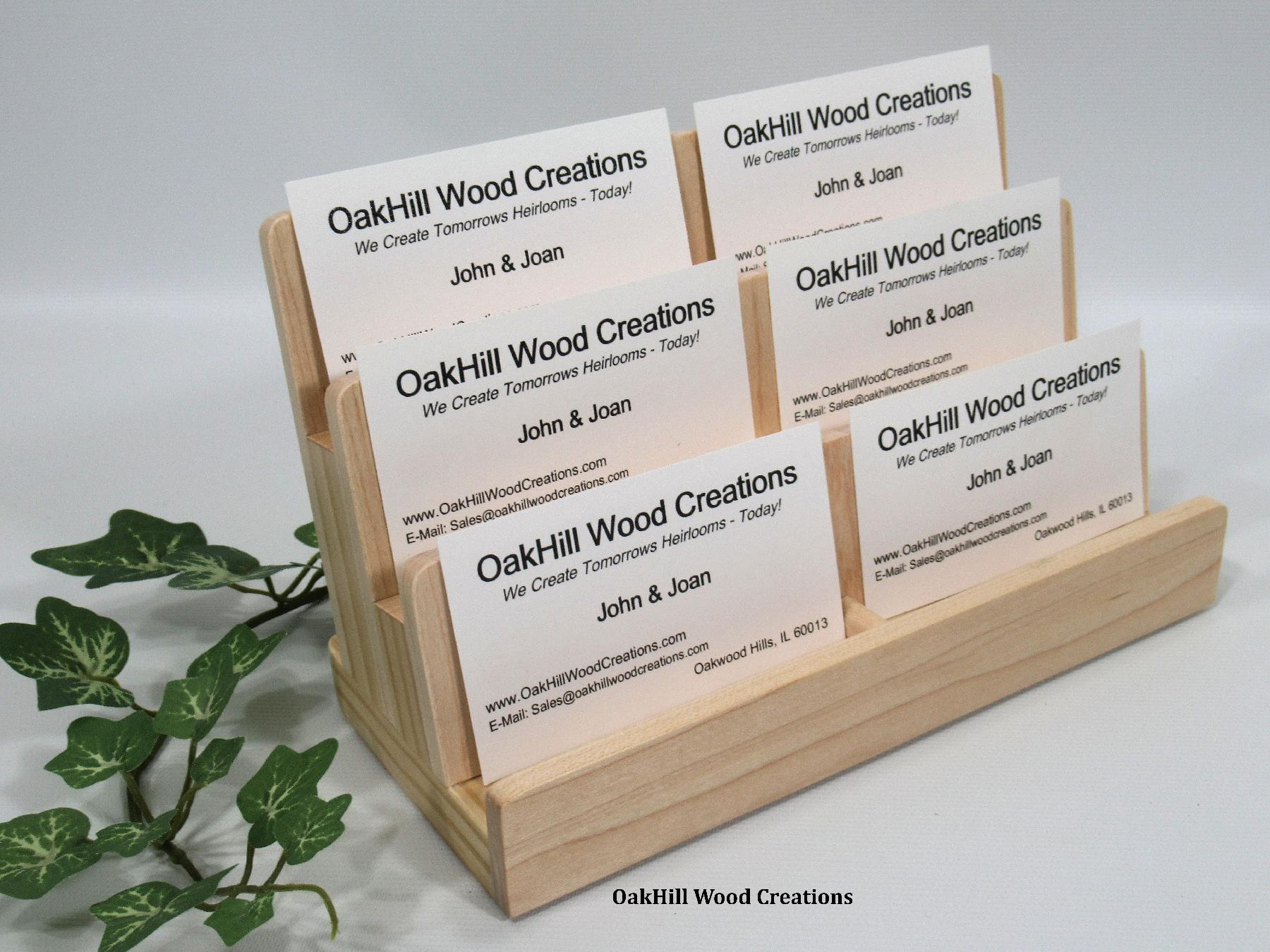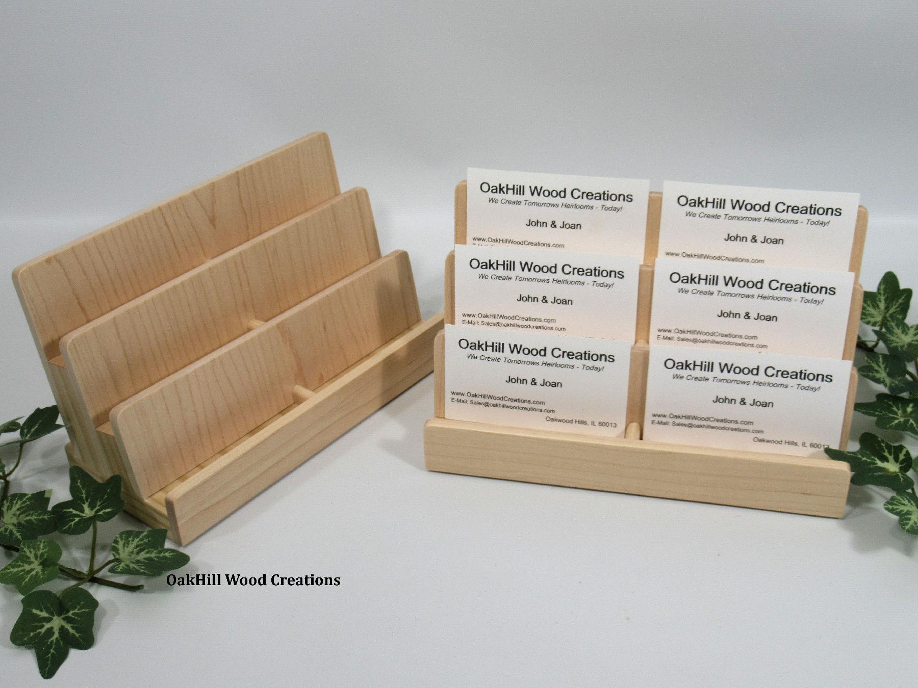 Business Card Display Stand, 6 Card, 3 Tier, made from Hard Maple and Select Pine in a natural wood color will ideally fit into any office décor. Our Business Card Stand’s Compact design will hold up to 6 different sets of Standard Business Cards, approximately 30 cards per set depending on the thickness of your card stock. Make your countertops work for you!Click here to purchase from our Etsy store