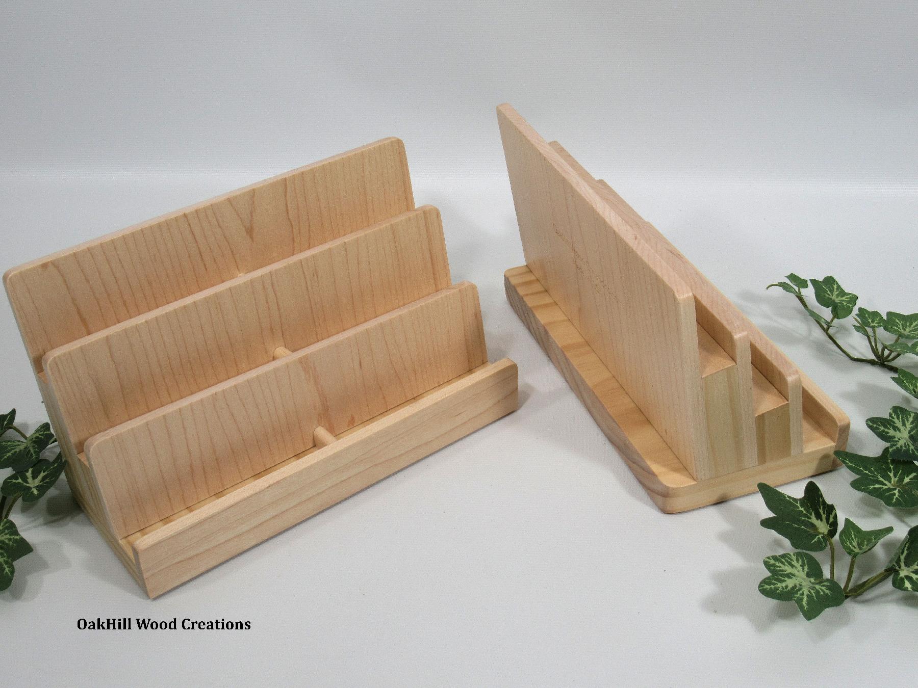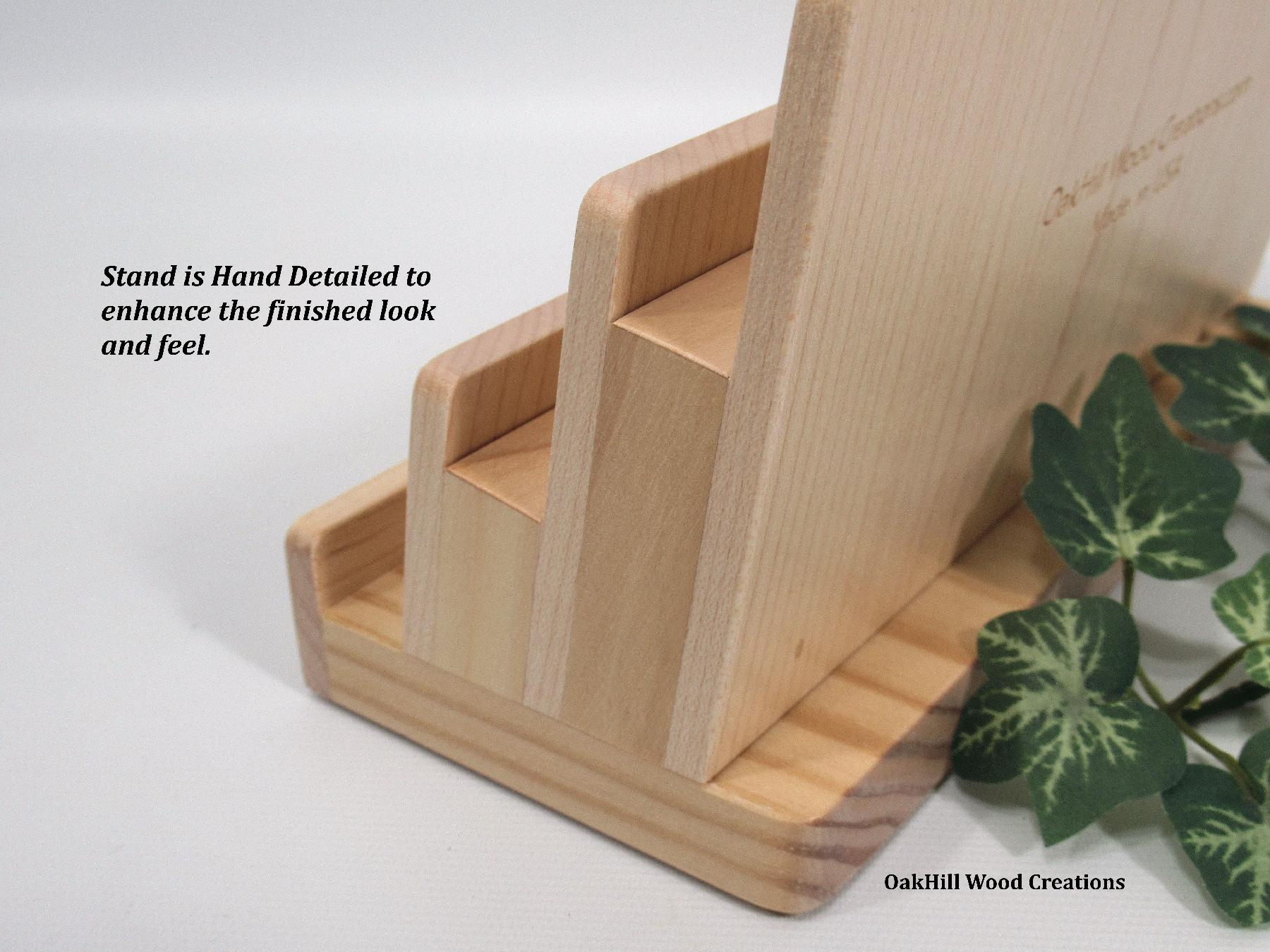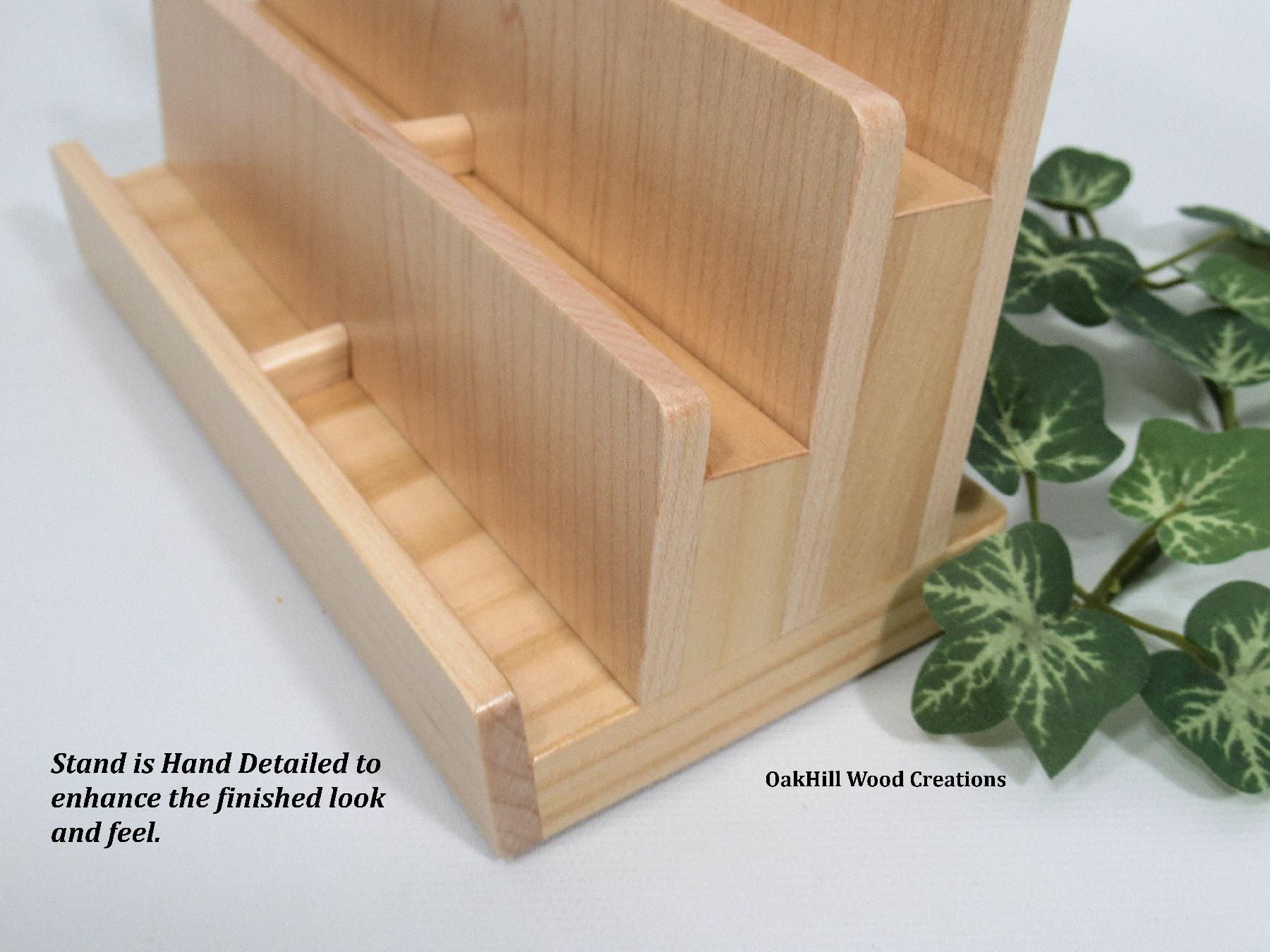 Business Card Display Stand, 6 Card, 3 Tier, made from Hard Maple and Select Pine in a natural wood color will ideally fit into any office décor. Our Business Card Stand’s Compact design will hold up to 6 different sets of Standard Business Cards, approximately 30 cards per set depending on the thickness of your card stock. Make your countertops work for you!Click here to purchase from our Etsy store