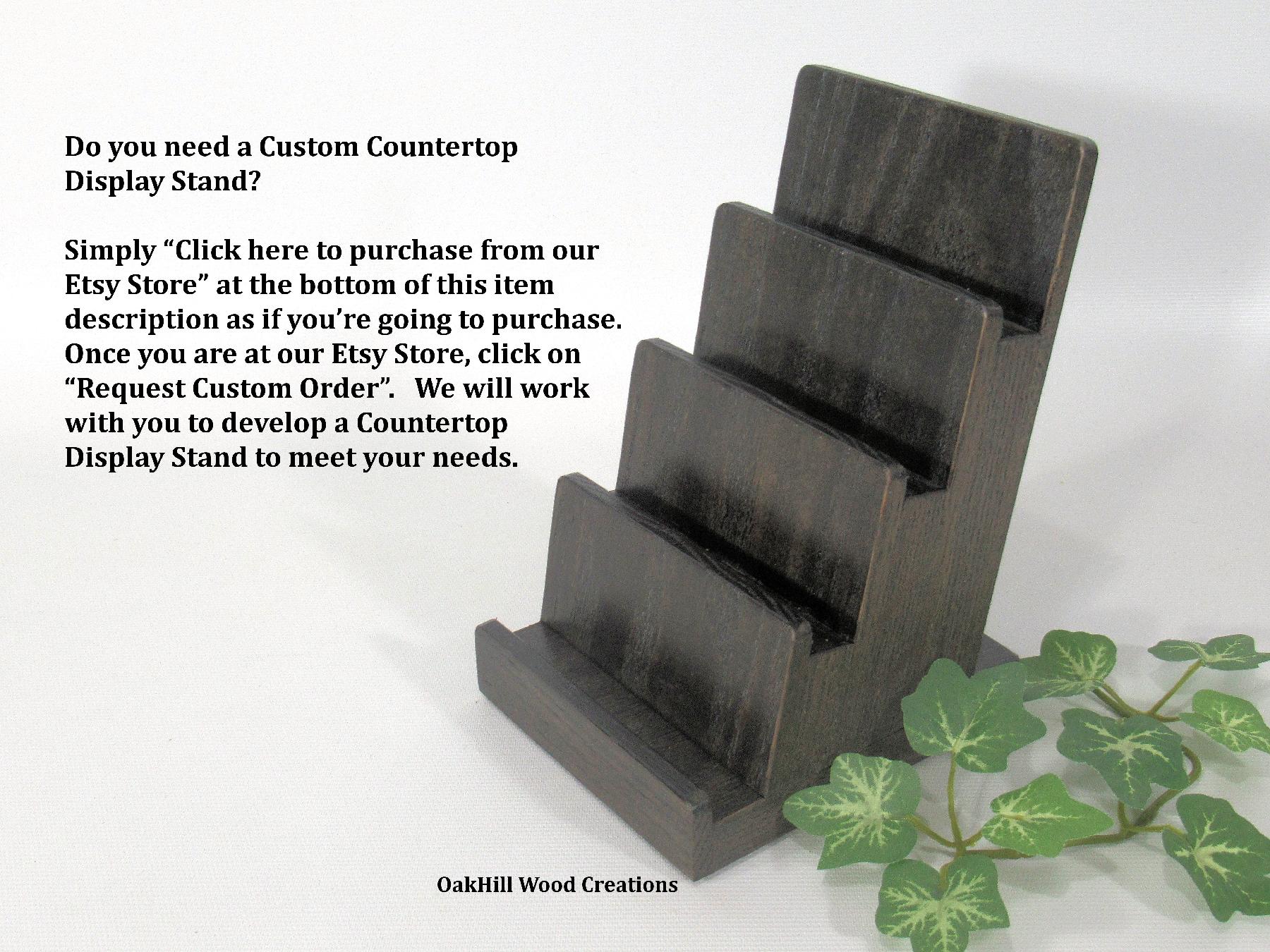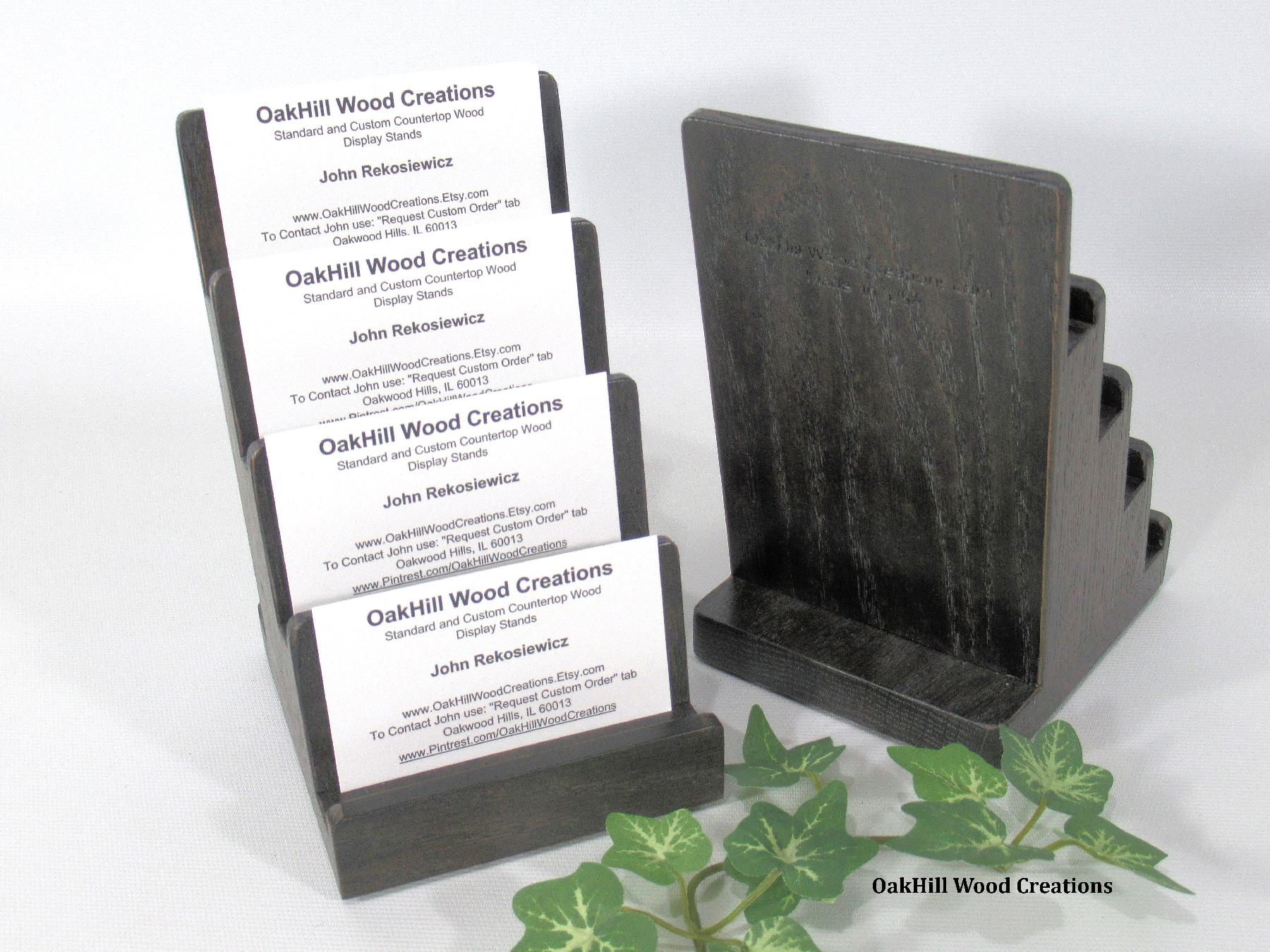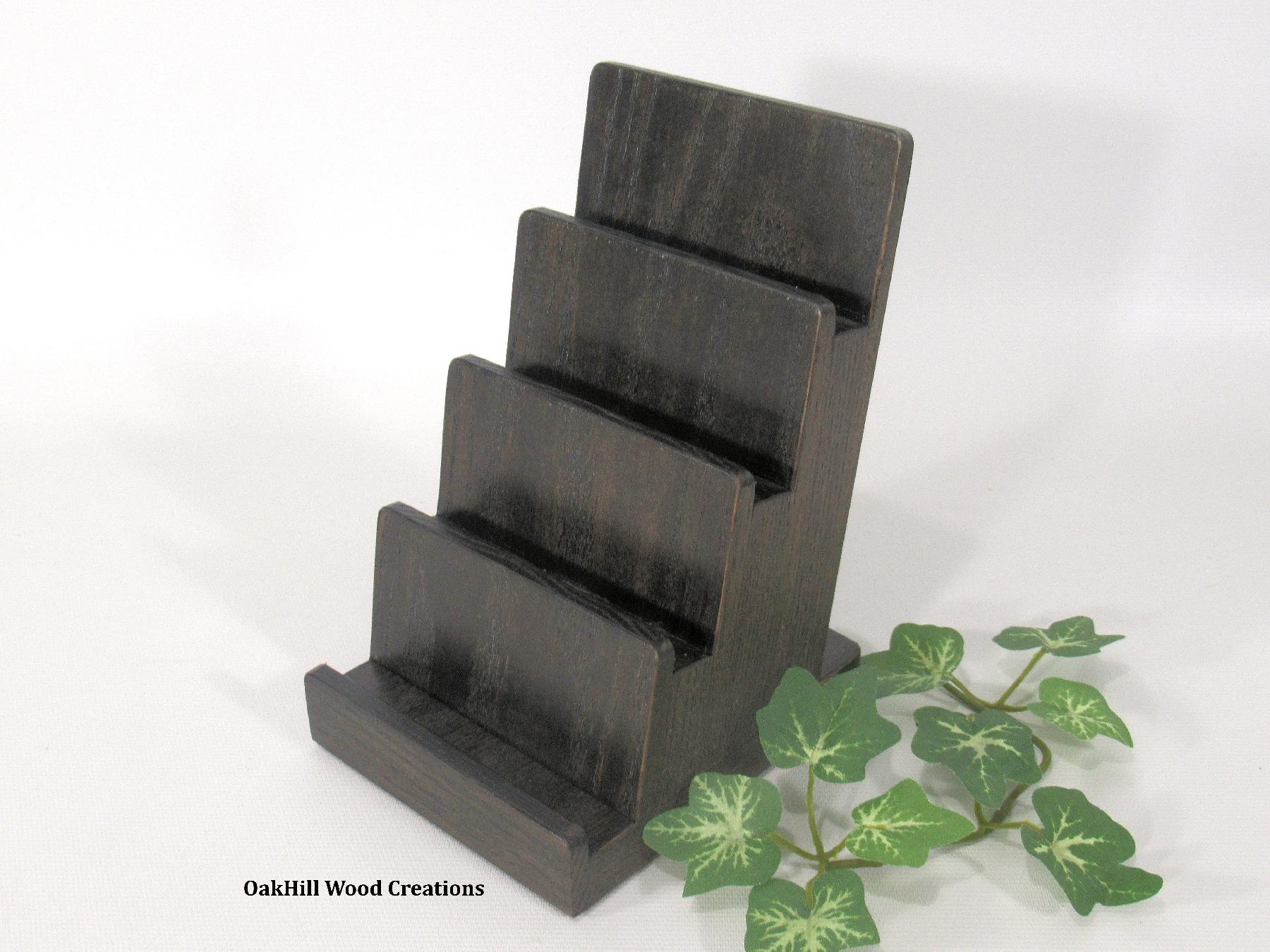 4-tier solid oak business card holder in ebony stain. Perfect for offices, trade shows & reception desks. Holds 4 sets, 30 cards each.Handcrafted from solid American oak with a rich ebony stain, this 4-tier display stand adds a refined touch to any professional space. Ideal for reception desks, offices, conventions, and retail counters, it keeps your cards neatly organized and easily accessible.
